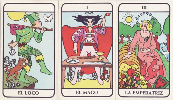 31 December 2008 I sometimes wonder if I am not the most obsessive of tarot collectors. Sometimes I get rather engaged by a particular deck and try hard to find a copy. Often these are not especially collectable, nor of great artistic merit and seem to have little perceptible value. One of these I have been looking for over the last few years is a deck issued free with the Spanish magazine Superpop. Now there is a well known Superpop tarot and it is relatively easy to find, but Superpop issued another deck El Gran Juego del Amor ('The Great Game of Love') which proved quite elusive. I finally managed to buy a copy from someone in Spain and it arrived today. It is one of those press-out tarots, printed on thickish card bound into the magazine - even the box is a press-out. It is surprising how decks like this, given away free in magazines, are so very difficult to find. I have many such from Japanese magazines, where they are called Furoku (gifts). Although at the moment these have little perceived value, as collectors tend to assign high prices to better known rare decks, such as the Greenwood, but I expect, in the years to come, as people expand their collecting vision, decks such as this from Superpop will acquire a more realistic value. The artwork, in watercolour, is bright, using large areas of colour.