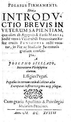 The Pegasus of the Firmament by Joseph Stellatus Otherwise - A Brief Introduction to the Wisdom of the Ancients, which was once called "Magic" by the Egyptians and Persians, but today is called properly "Pansophy" by the Venerable Brotherhood of the Rosy Cross; composed in thanks to Righteous and Diligent Youth by Joseph Stellatus, Student of the Secret Philosophy. The Likeness of a Pegasus. The Pegasus shall fall onto the land from the lofty heavens, To purify everywhere the hurts of Maiden Europe With thanks to Apollo and the particular prerogative of the Muses. In the Year 1618. Translated by: Dr. Shawn Daniels. German sections translated by Christine Eike. Commissioned by Samuel Robinson from Pansophers.com. Coordinated by Frater KRI Translations financed with thanks to: Richard Cloud, Ramon Light, Frater KRI, Paul Gaza, Patrick Keep, Stephen Murtaugh Adrian Brown and Samuel Robinson Cover book artwork by Stephen Murtaugh. Copyright notice: Creative Commons license issued by Samuel Robinson 2017 Translated by: Dr. Shawn Daniels. German sections translated by Christine Eike. Commissioned by Samuel Robinson from Pansophers.com. Coordinated by Frater KRI Translations financed with thanks to: Richard Cloud, Ramon Light, Frater KRI, Paul Gaza, Patrick Keep, Stephen Murtaugh Adrian Brown and Samuel Robinson Cover book artwork by Stephen Murtaugh. http://pansophers.com/pegasus/ Copyright notice: Creative Commons license issued by Samuel Robinson 2017 pansophers.com/pegasus/
