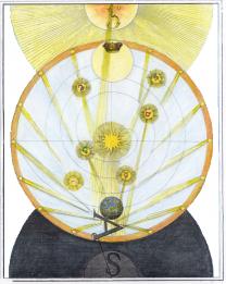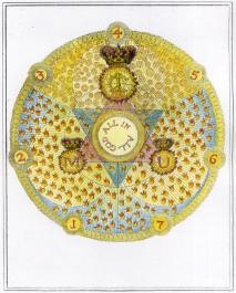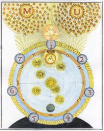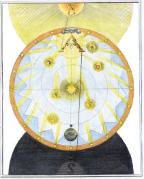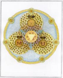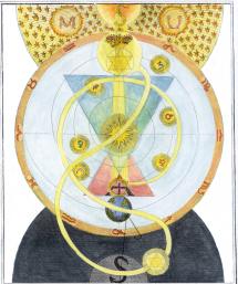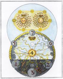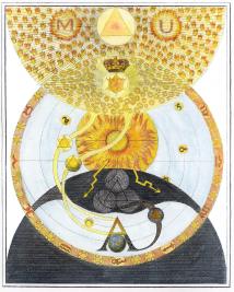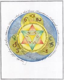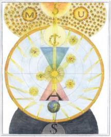 Adam McLean's Gallery of alchemical images Freher Series This series which D. A. Freher designed at the beginning of the 18th century, to illustrate the deep pirnciples of Jacob Boehme's philosophy, was included as full page engravings in the William Law edition of Boehme's works, published in 1764-81. These illustrations particularly deal with cosmology, and especially the emanation of the spirit and its encounter with matter initially through Adam and then through the intervention of Jesus Christ in spiritual evolution. I have tried to reflect this spiritual philosophy in the colouring scheme I have adopted. High quality images available as printed books from Blurb or in downloadable file Go back to alchemical images index page