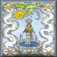 Over the past ten years or so I have been making handcoloured emblems by painting with watercolours copies of woodcuts and engravings from printed books and some manuscript drawings. In colouring these I made use of my intensive study of the original coloured manuscripts of the 15th to 18th centuries, which have been the main focus of my research over the past years. I have often found that by contemplating and meditating on these handcoloured images one can resonate with and enter into the complex symbolic world of alchemy. I regret that I can only supply these images as these small thumbnails on this internet web site. Earlier in 1999 I did place full page images on this site, but some people just took these without my permission and used them in their own web sites and in other projects. One person in particular even claimed he had copyright over an image that I painted and is still hanging on my kitchen wall ! Thus I have had to restrict these pictures to these small thumbnails which are too small to use especially for printing. I am, in general, willing to allow my paintings to be used by others on their web sites or other projects, but only if they first request my permission and give me credit for my work. See my policy regarding use of my copyright images.