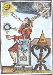 A061. 'Ora et labora' woodcut from Medicinisch-chymisch- und alchemistische Oraculum, Ulm 1755. |