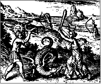 The People of Epyrus worshipped a Dragon in the Temple of Apollo in memory of Python that was slain by him. There is by Nature a continuall war between the Dragon and the Elephant, at whose eyes and throat he always strikes, till the Elephant falling upon the ground kills the Dragon with his Weight, from whence by many is said to come that Dragon's Blood which is imported into these parts. The Dragon's Eyes are of equall Value with Jewells. His sight is very sharp and clear, and therefore he is placed as a guard over Treasures, as to the Garden of the Hesperides and the Golden Fleece at Colchis. The Ancients also joined him to Æsculapius as a Hieroglyphick.
