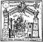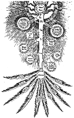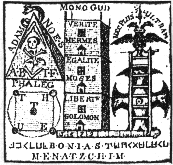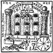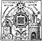 3 4 ![]() ![]() The final square at the top of the oval space is an elaborate symbolic statement of the operative use of this whole complex of symbolism of the Cubic stone. A heptagon set in a circular space radiates outwards beams of light, while around it is the statement familar in Rosicrucian circles 'In Hoc Signo Vinces' - 'By this sign you are successful'. A priestly figure crowned with the spirit (H.P. ='High Priest' ?) stands on a globe of the world set in front of a six-columned temple. He extends his right hand holding six stars while his left points to a triple headed dragon. Thus he attempts to unite the above and the below-the realm of the cosmic spirit with that of the inner dragon. To his right is a vessel burning incense signifying the purification of the ritual space through air and fire. Between his teeth he holds a dagger while upon his vestments is a seven sided medallion with a 'K'. |