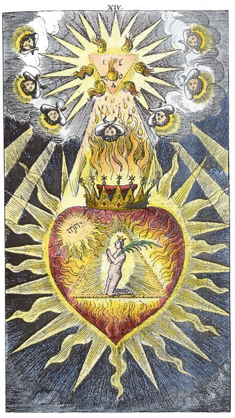 The book Helleleuchtender Hertzens-Spiegel was printed in 1680. The emblems were devised by Nicolaus Häublin, a minor artist and engraver and the text seems to be by Paul Kaym, who was a mystic and a close friend of Jacob Boehme.