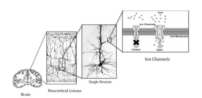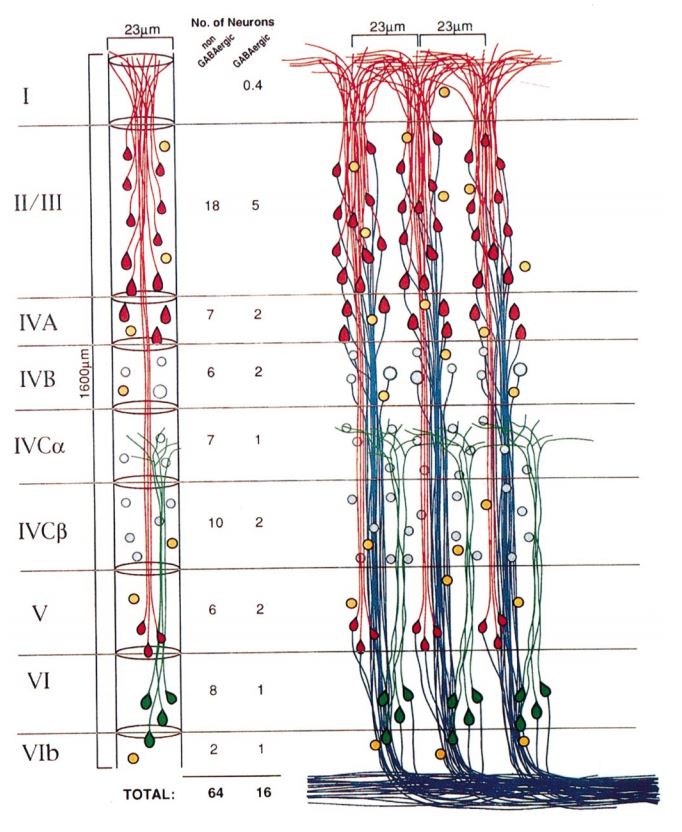 In recent decades there has been a move somewhat away from viewing the individual neuron as the primary unit in brain activity. In the neocortex, it is now generally accepted that the functional units are the vertical columns of around 100 neurons with more associated cells (glial and others). These columns hav various layers with inputs through axons in layer IV and outputs through axons in layer V. Layers II and III have links to other cortical columns. The inputs and outputs can be either excitatory or inhibitory. This arrangement of cells is not merely driven by action potentials (electrical signals) but its activity is structured by its internal chemical environment, particularly through neurotransmitters. GABA (gamma-aminobutyric acid) is an inhibitory neurotransmitter and operates by opening a channel that restores the resting potential of the neuron. GLU (glutamate) is excitatory and operates by opening ion channels. The biochemistry of these cortical columns is extremely complex with many other substances affecting the state of the system. We can see this, as the complex cells being in a stable state, until an incoming stimulus through an incoming axon. Some of these axons originate from neurons in the thalamus and other subcortical structures. |