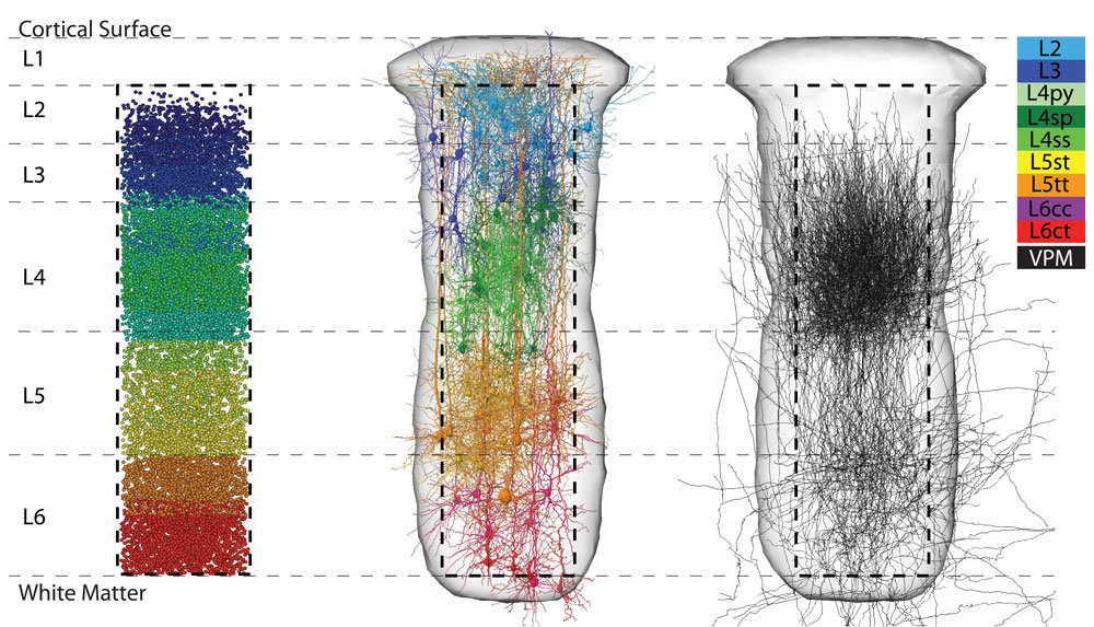 Evidence based on various studies of the neocortex of the brain indicate that the neurons are arranged in vertical columns of about 100 cells. These have distinct layers, some of which have connections to the the thalamus, forming feedback loops. It is suggested that each column is the structure which holds pieces of information, perhaps even components of experiences or stored fragments of memories. These cortical columns have many interconnections, so that excitation of one column may make others actively spike. Thus a complex scenario, concept or memory may involve the working together of a number of columns. Click here for details. Here are two videos based on actual photographs which were created to visualise the structure and activity of cerebral columns. Click here to view. Click here to view. More on cerebral or neocortical columns.