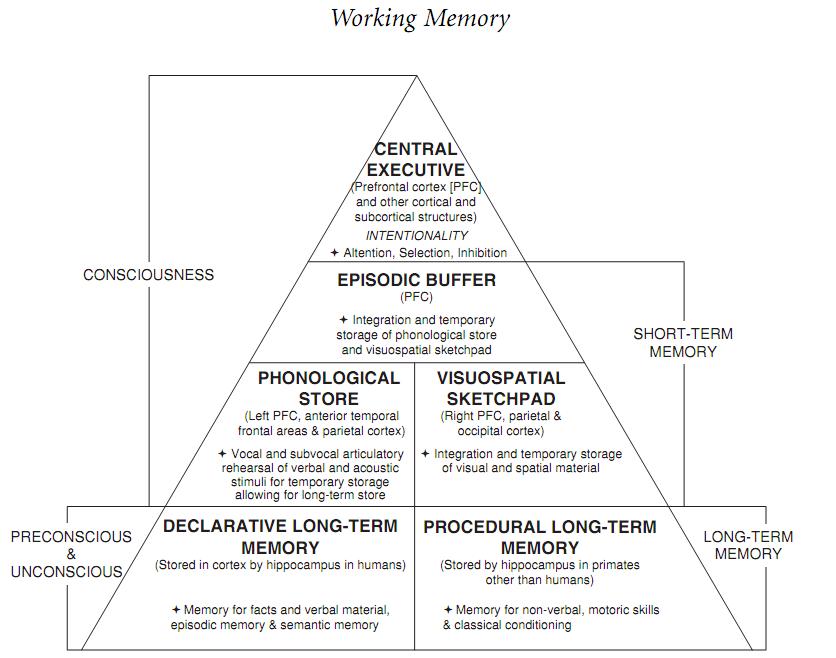Cognitive psychology in its modern sense began in the 1960’s. In 1974, Baddeley and Hitch devised a model of working memory which they explored through laboratory experimentation. They realised that short-term or 'working' memory had a number of separate components the properties of which could be investigated in detail through experiments.![]() The phonological loop is involved with sound or phonological information. It has two subcomponents - a short-term phonological store that rapidly decays and an articulatory loop that can revive the memory traces by acting as the "inner voice" that repeats the series of words (or other speech elements) on a loop to prevent them from decaying. ![]() The visuo-spatial sketchpad is a short-term memory store, independent of the phonological loop, which holds visual information for manipulation, but only a total of seven items, plus or minus two items, can be stored here for a very short period of time, usually a matter of seconds. The episodic buffer links information across domains to form integrated units of visual, spatial, and verbal information in a time sequence or episodic ordering, such as the memory of a story or a movie scene. ![]() These components of our short-term memory are coordinated by the central executive, which directs, focusses and targets information, making short and long-term memory work together. It is a supervisory system over the visuo-spatial sketchpad (visual information) and the phonological loop (verbal information), either inhibiting their actions or giving them attention and focus. It is now thought that it is not centralised in a specific brain region but is more dispersed. Short-term Memory.