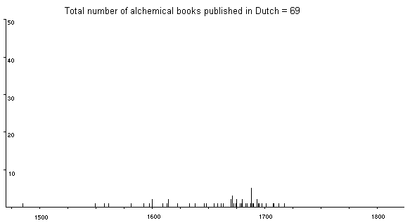Chart of Alchemy printed books in DutchThis is a chart showing the history of alchemical publication in Dutch. We can note a small steady trickle of publications beginning in the middle of the 16th century, with a peak of publication between 1680 and 1700. The rate of book production drops off completely in the 18th century.Back to Statistics.