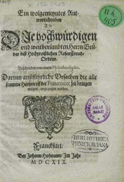 Ein wolgemeyntes antwortschreiben an die hochwürdigen und weitberümbten Herrn Brüder desz hochpreiszlichen Rosencreutz-Ordens (1619).
