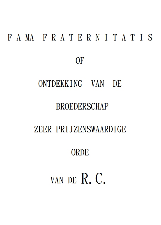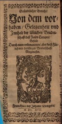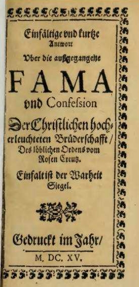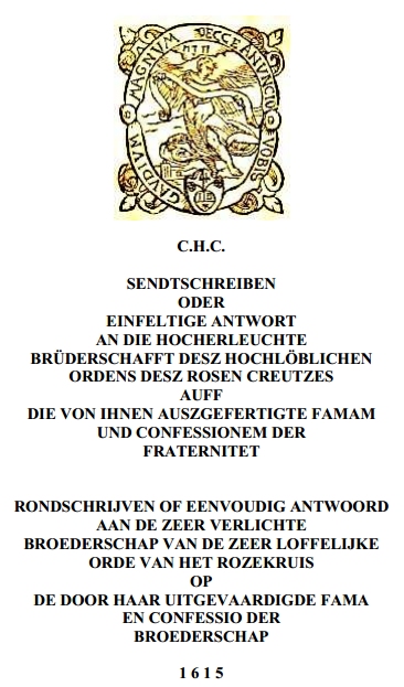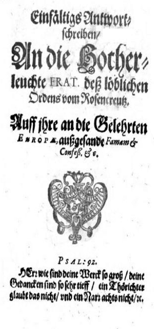 Sendtschreiben oder Einfeltige Antwort and die hocherleuchte Brüderschafft desz hochlöblichen Ordens desz Rosen Creutzes Auff Die von ihnen auszgefertigte Famam und Confessionem der Fraternitet: Durch einen waren Liebhaber der vollkommenen Weiszheit gestellet und auszgesandt. (1615).