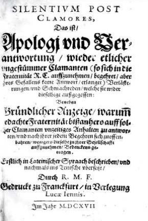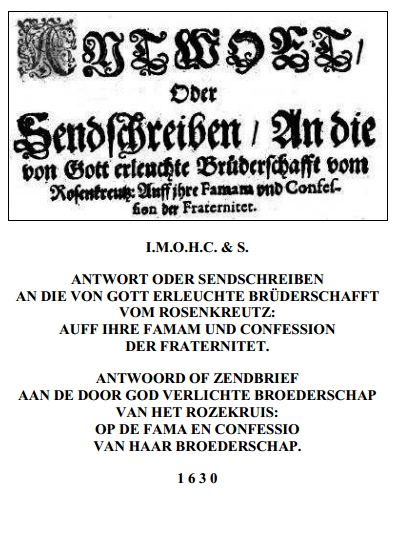 I.M.O.H.C. & S. Antwort oder Sendschreiben an die von gott erleuchte Brüderschafft vom Rosenkreutz: auff ihre Famam und Confession der Fraternitet. 1630