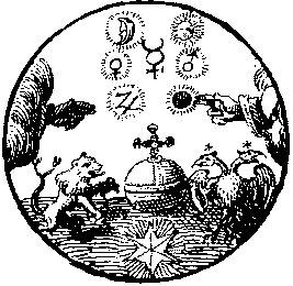 A light hand of God emerges both from the right and a dark hand of God from the left, both giving the sign of blessing. In the centre is placed an orb with a cross. A star is seen on the ground below. Above in the heavens is the symbol of Mercury, surrounded by the other planets - to the left Moon, Venus and Jupiter; to the right Sun, Mars and Saturn. To the left of the orb is a lion rampant, while on the right is a two-headed eagle with a small star set over each head.