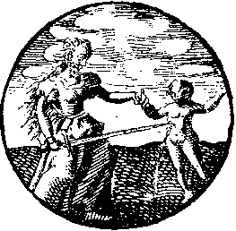 A woman pierces with a long sword the breast of a young child she holds with her left hand.