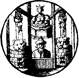 Two furnaces are set within a complex wooden frame. Both have a round furnace as their lowest part, on top of which is a lion's head, then a thin column rises up with a sun or moon set upon it, and the top appears to have a fountain like structure with spouts entering into a small circular basin. In the space between these two furnace -fountains we see at the bottom, the upper torso of a man, and above him, the upper torso of a woman set on a hexagonal plinth.