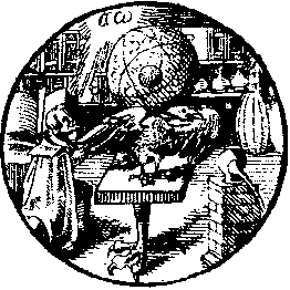 In his study a philosopher kneels facing right in an attitude of prayer. A beam of light descends upon him from a radiance labelled with the greek letters alpha and omega. On the table in front of him, which has a single bird's claw pedestal, is an eagle with wings outspread. His study is lined with books, flasks and a lute, and in the foreground an alembic is seen upon a circular furnace.