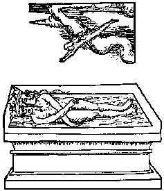 The Reviving. The hermaphrodite or conjoined King and Queen still lies as if dead in a sepulchre. A small female spirit descends from the clouds above.