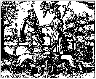 A King and Queen stand on the backs of a two-bodied, one-headed lion. The King on the left reaches out with his right hand and grasps the right hand of a Queen standing upon the right body of the lion. The King holds a sceptre and the Queen a triple flowered lily plant. From above a bird descends bearing a six-pointed star on its body. From the mouth of the lion comes forth a stream of water or other liquid.