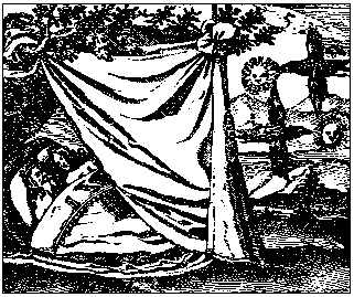 The Conjunction, Coniunctio or Coitus, of the King and Queen occurs in a bed under the branch of a tree, from which a curtain hangs down. Beside them two birds chase the Sun and Moon in opposite directions.