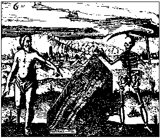 The Conception or Putrefaction. The King and Queen lie as if dead in a sepulchre or coffin. Saturn on the left points to this, while on the right a skeleton stands with a scythe.