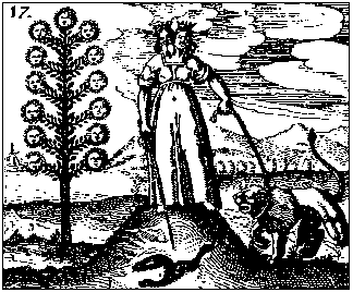 The Demonstration of Perfection. A hermaphrodite of the King and Queen, stands upon a small hill under which a three headed snake appears. The hermaphrodite holds in its right hand a stick which it points towards the snake, and in its left hand it holds a lion by a leash. On the left is a Sun tree with thirteen Sun flowers.