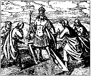 The King rises from a sepulchre, his left hand held in a gesture of blessing towards four men who approach. In his right hand he holds a sceptre.