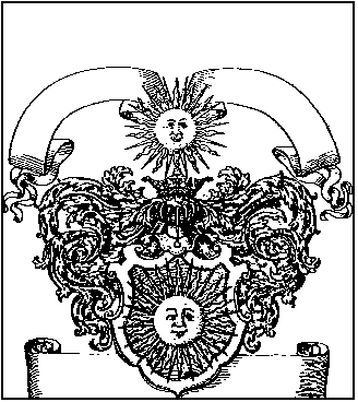 A coat of arms with ornate foliage, has a shield bearing the image of the Sun. Above this another Sun shines down.