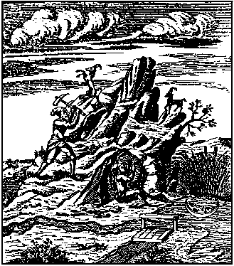 Two miners excavate a small hill with pick-axes. Upon this hill are two deer. In a lake at the base is a crescent Moon.