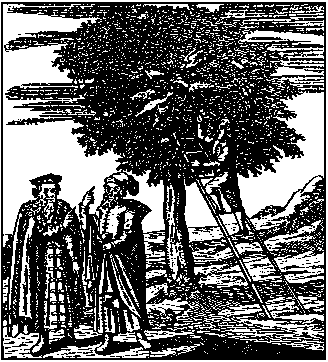 Two philosophers discuss matters under a tree which has a crown around the base of its trunk. They point to the branches of the tree within which are a number of black and white birds. A man is climbing a ladder to collect something from the tree.