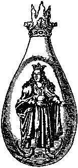 Within a crowned flask with open top, a Queen stands holding an orb in her right and a sceptre in her left hand.