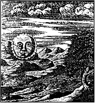 In a landscape with trees, a dark Sun or Moon rises or sets behind a hill.