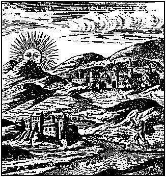 A traveller across a landscape approaches a town. He gazes at the Sun rising or setting behind a hill.