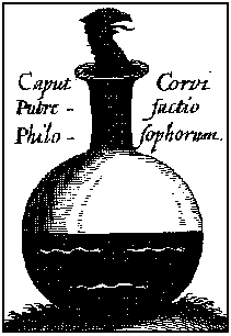 Caput Corvi. The head of the crow, or putrefaction of the philosophers. Inside the flask is a layer of black substance within which are a number of snakes. From out of the neck of the flask emerges the head of a black crow.