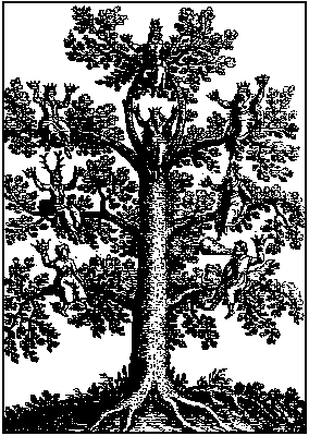 Eight figures, four kings and four queens holding crowns are seated in the branches of a tree.