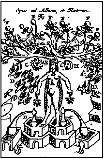 The Work for the White and the Red. A naked Queen stands on two furnaces which have alembics set upon them, distilling liquids into two flasks. She holds in each hand an upside -down flaming torch. Behind the Queen is a tree bearing round fruits. Seven birds fly between the branches of the tree and the earth below, four flying downwards and three upwards. On the left and right are two rocky mountains, and upon the summit of each of these a young bird perches. On her crown a large bird perches, and to the left of her head is a Sun and to the right a Moon.