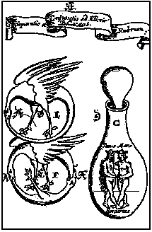 The Separation and Conjunction for the Red Elixir. On the left is a figure of eight ouroboros. The lower circle is formed by two dragons seizing each others tails the uppermost being winged. The upper circle is formed by a single winged bird-dragon forming an ouroboros by seizing its tail in its mouth. On the right is a large flask into the neck of which a small flask is upended. Within this flask a naked queen labelled 'Venus' and a naked king labelled 'Mars', embrace on another. Below them is the word 'Mercurius'.