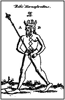 The Rebis Hermaphrodite with two aspects. A crowned hermaphrodite with two faces, a male on its right side and female face on its left, walks in a landscape holding a sceptre in its right hand.