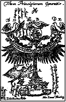 The Generation of the Three Principles. Christ crucified is depicted as a double-headed eagle. On the halo around his head a triple-headed bird perches. Two birds fly above his wounded hands, which appear at the ends of the wings of the eagle, carrying crowns. Above his right foot which appears at the tail of the eagle a dark bird flies with a dark crown. His left foot is already crowned. He stands upon a strange double-headed body.