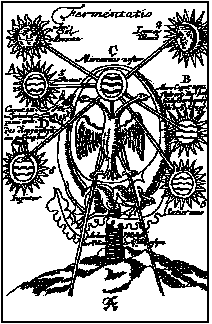 Fermentation. A dragon, which grows on the trunk of a tree labelled 'arbor philosophorum', forms an ouroboros, by seizing its tail in its mouth. Within the circular space is a double-headed eagle. Above its head is a planetary disc labelled 'our Mercury' which is connected by rays to six other planets arrayed around the dragon - on the left, Sun, Venus and Jupiter, on the right, Moon, Mars and Saturn.