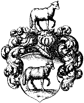A stylised coat of arms, showing a lamb with its left front hoof raised from the ground standing above a helmet set in a foliage. Below on a shield another lamb is shown making the same gesture.