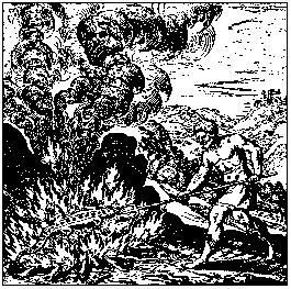 In an open landscape an artisan with a triple pronged trident places a salamander in a fire (or perhaps tries to capture it from the flames). The salamander or lizard has a line of stars along its back.