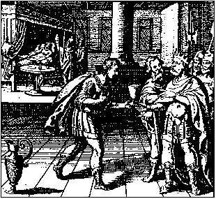 In the foreground a sick King supported by a councellor and two soldiers, received a cup of medicine from a man entering from the left. At this man's feet is a vase or vessel. In the background the king lies in bed, while two physicians or doctors examine him.