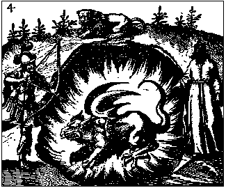 Within a cavern in the side of a mound or hill a winged dragon lives in a blaze of fire and flames. On the right a bearded philosopher stands and points to the dragon, while to the left an armoured knight Is about to shoot an arrow at the dragon with his bow. On the hill above a Lion lies, and seven plants grow out of the hill.