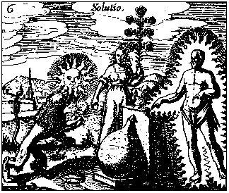Solutio. On the right, a man naked except for a lonincloth stands in a nimbus of flaming fire pointing with both hands to a receiving flask set into the side of a large square furnace. On the left a lion is in act of devouring a sun disc in the air. In the centre a woman stands, holding up in her left hand a plant with seven roses, while she points to the ground below the lion with her right forefinger.