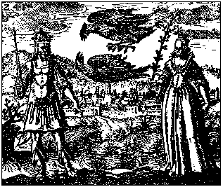 A King stands on the left holding a sceptre in his right hand, while a woman stands on the right holding a three blossomed lily branch in her right hand. In the air between them are two black birds or crows, the lower one upside down and the higher upright. Beside the King is a regenerating tree stump.