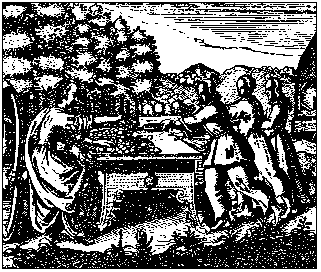 A woman sits at a table which is covered in coins. Three poor people approach her holding out begging bowls.