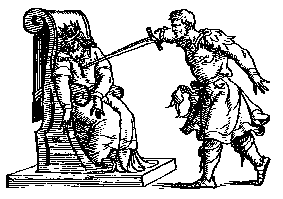 A man with a sword on the right approaches the King seated on his throne, pierces his breast with the sword and kills him.
