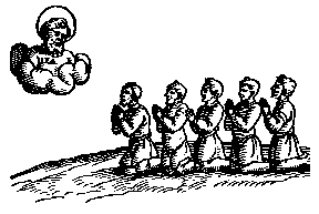 The figure of God in a cloud appears before five young men who kneel on the ground in prayer.