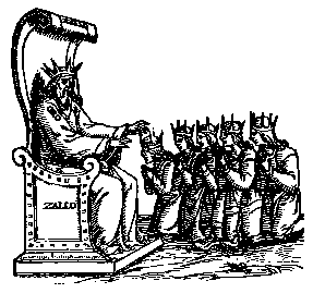 On the left the King sits on his throne, and raises his hands in blessing over the heads of five kneeling crowned princesses.