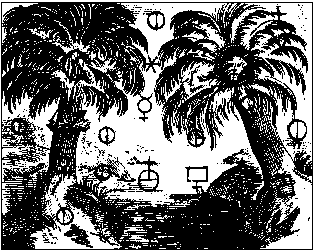 Two palm trees stand on the opposite banks of a river with the Mercury symbol within it. The tree on the left has the Jupiter, Mars and Moon symbols on its trunk and Salt at its base, while that on the right has Saturn, Venus and the Sun on its trunk and Tartar (?) at its base.