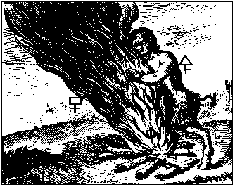 A faun on the right with cloven hoof embraces a fire (marked Salt). Beside him is the symbol of Sulphur, while the smoke which rises to the left is marked ?.